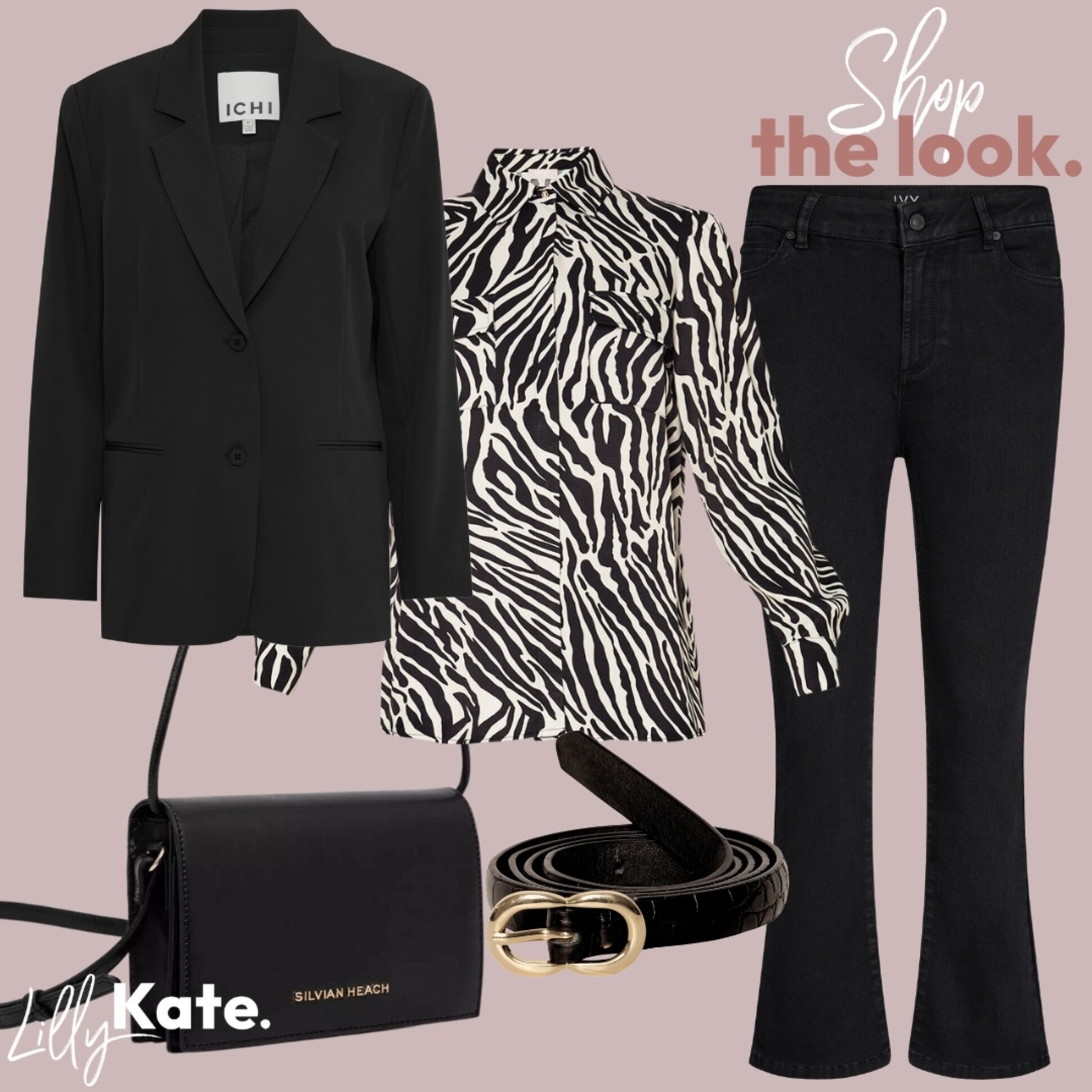 De basis van deze look is de zwarte flare jeans Tara van Ivy Copenhagen. Deze jeans is tijdloos en flatterend, en geeft je een slank silhouet dankzij de hoge taille en flared pijpen. Combineer het met de opvallende en elegante zebra-print blouse Camicia van Liu Jo. De speelse print voegt een trendy element toe aan je outfit en creëert een levendige uitstraling.