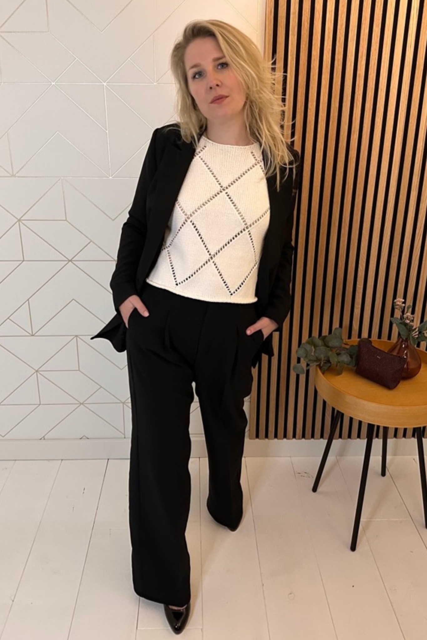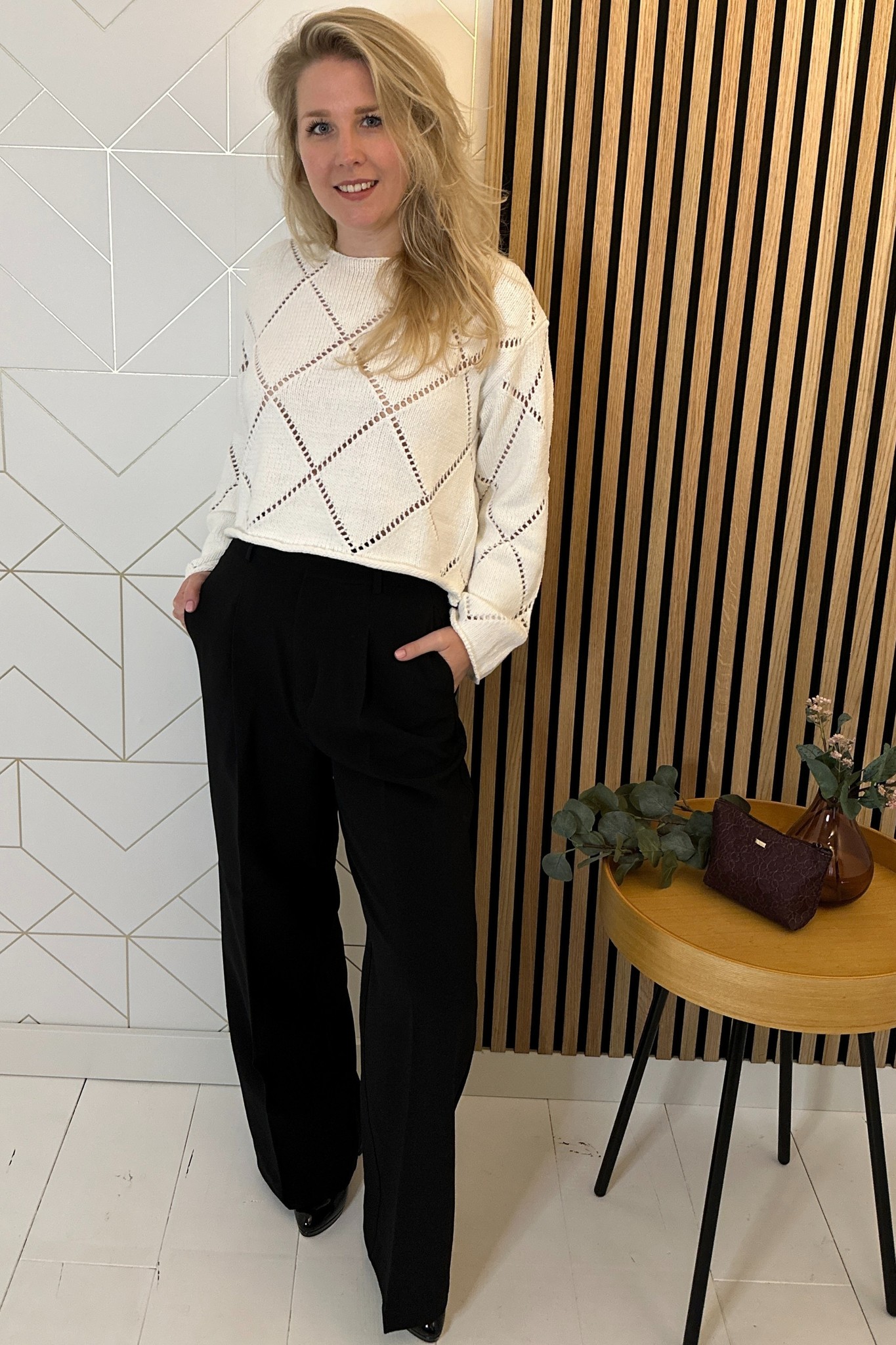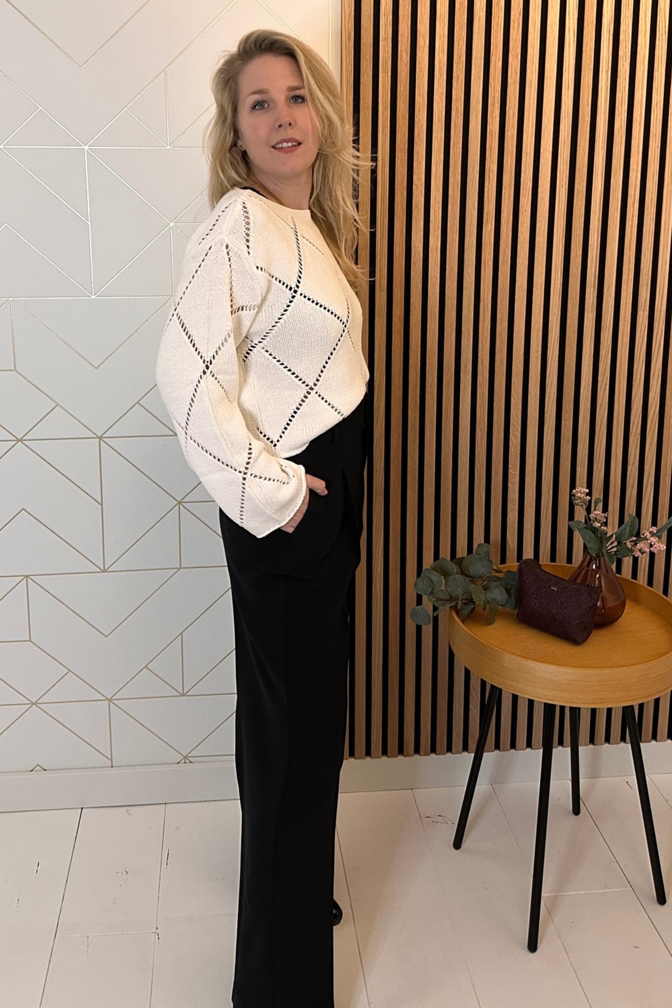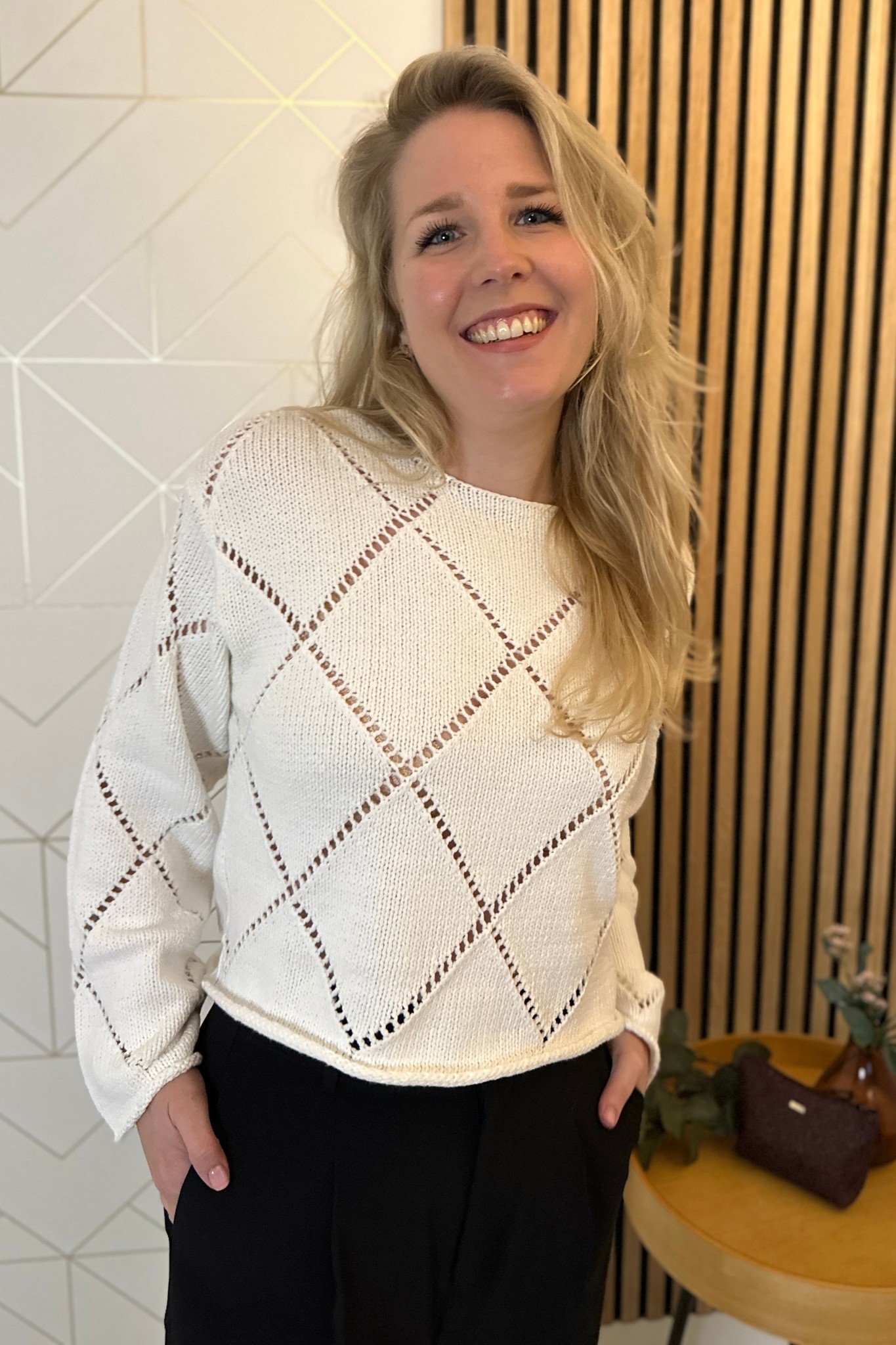 Fijne witte pullover van het merk Soaked in Luxury. Deze comfortabele trui combineer je goed met een destroyed mom jeans voor een casual look of een leuke roze broek. Perfect in de lente of de frissere zomeravonden. Ook prima te dragen naar kantoor op een pantalon of rok.