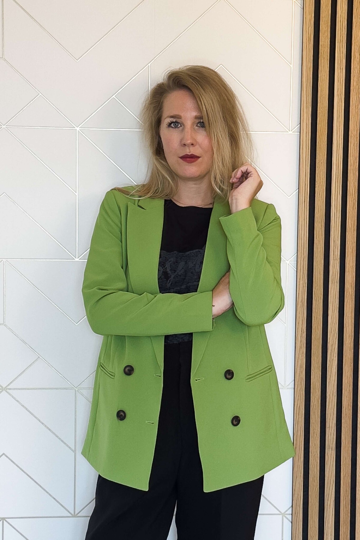 Stijlvolle groene blazer uit de Fall/Winter collectie van My Essential Wardrobe. Deze veelzijdige blazer voegt moeiteloos een trendy tintje toe aan je outfit. Of je nu naar een feestje gaat, een dag op kantoor doorbrengt of een avondje uit plant, deze blazer is de perfecte keuze.Voor een feestelijke look combineer je de blazer met een lichte blouse, een rok en elegante pumps. Op kantoor kun je deze blazer moeiteloos dragen met een pantalon voor een professionele uitstraling, of kies voor een stijlvolle jeans voor een meer eigentijdse en toch formele look.Ga je voor een ontspannen avondje uit? Combineer de blazer dan met een trendy top en een comfortabele flare jeans voor een moeiteloze en trendy outfit.Met deze groene blazer kun je verschillende stijlen en looks creëren, waardoor het een onmisbaar item wordt in je herfst- en wintergarderobe. Laat je persoonlijke stijl stralen met deze modieuze en tijdloze blazer.